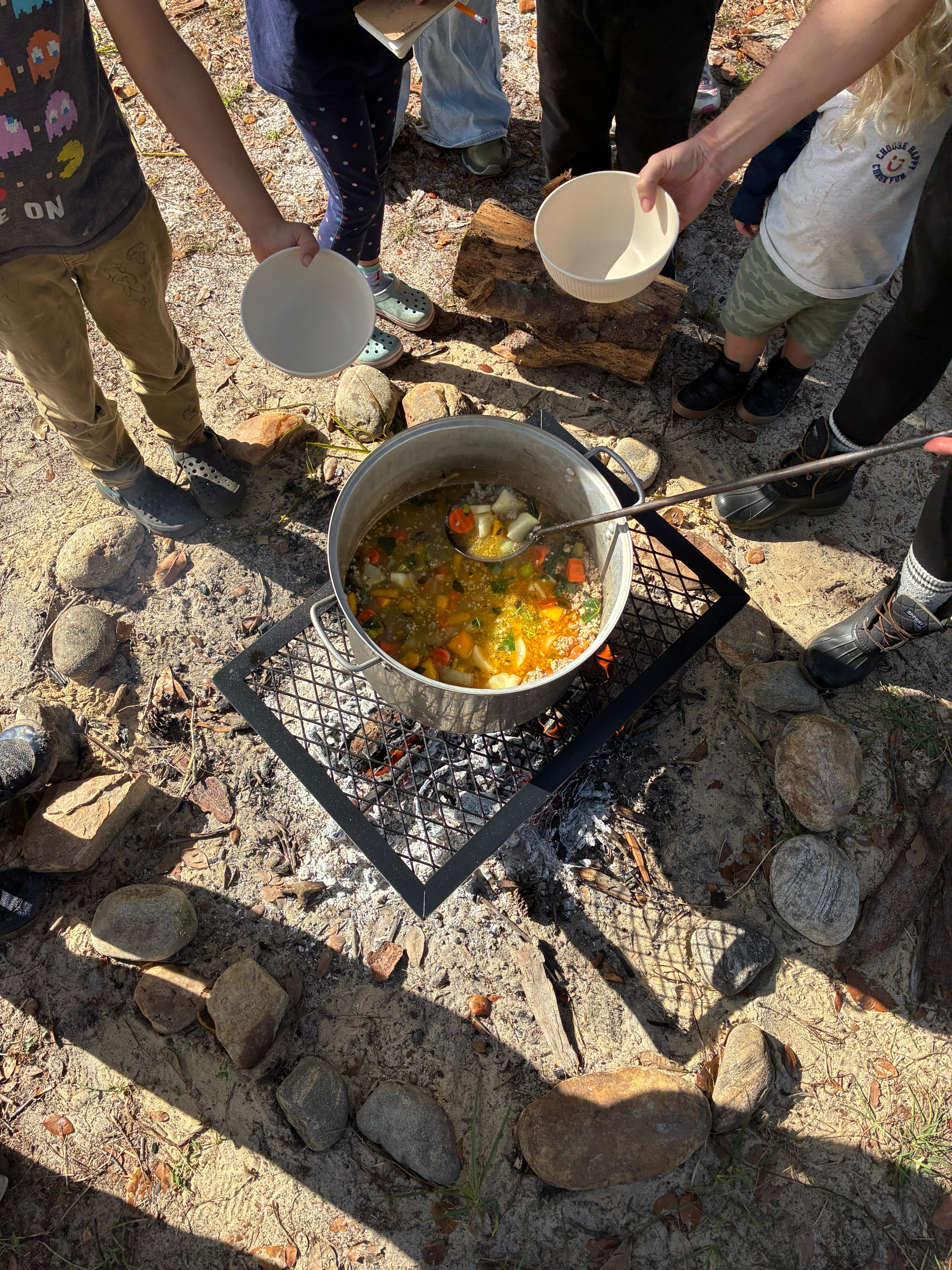 The kids reaaally got into the soup prepping and of course loved the energy of having a fire. We used chicken broth (homemade from my kitchen of course), carrots, celery, onion, pumpkin, cassava (from our food forest), and sausage.