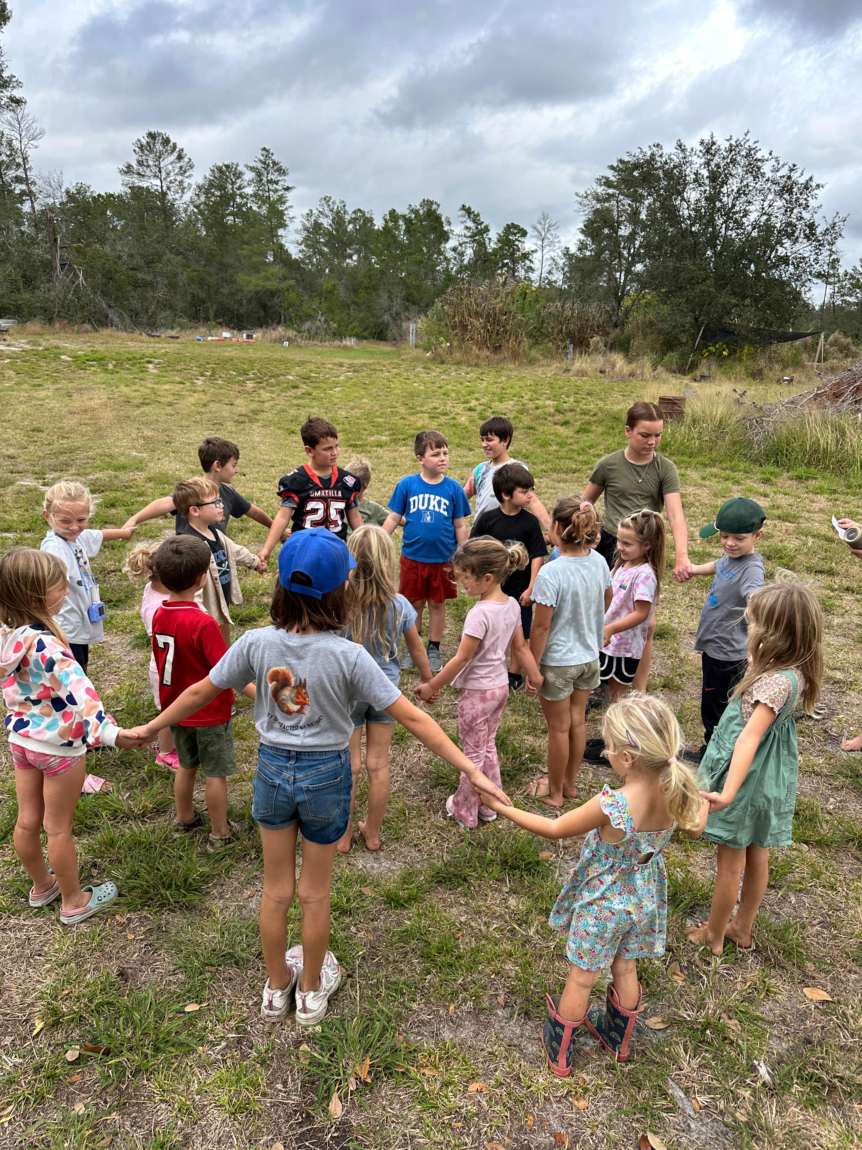 Winter in Florida doesn’t arrive all at once, so our days together were a mix of cooler air and warm sunshine. That rhythm fit our study well, giving us a taste of winter air, with lots of sunshine still to encourage continued outdoor play. We spent time observing reciprocity in the natural world — birds and berry trees, squirrels and oaks, fungi and roots, fallen leaves and living soil — and considering how these same patterns show up in our own relationships. We explored these ideas through hands-on activities.