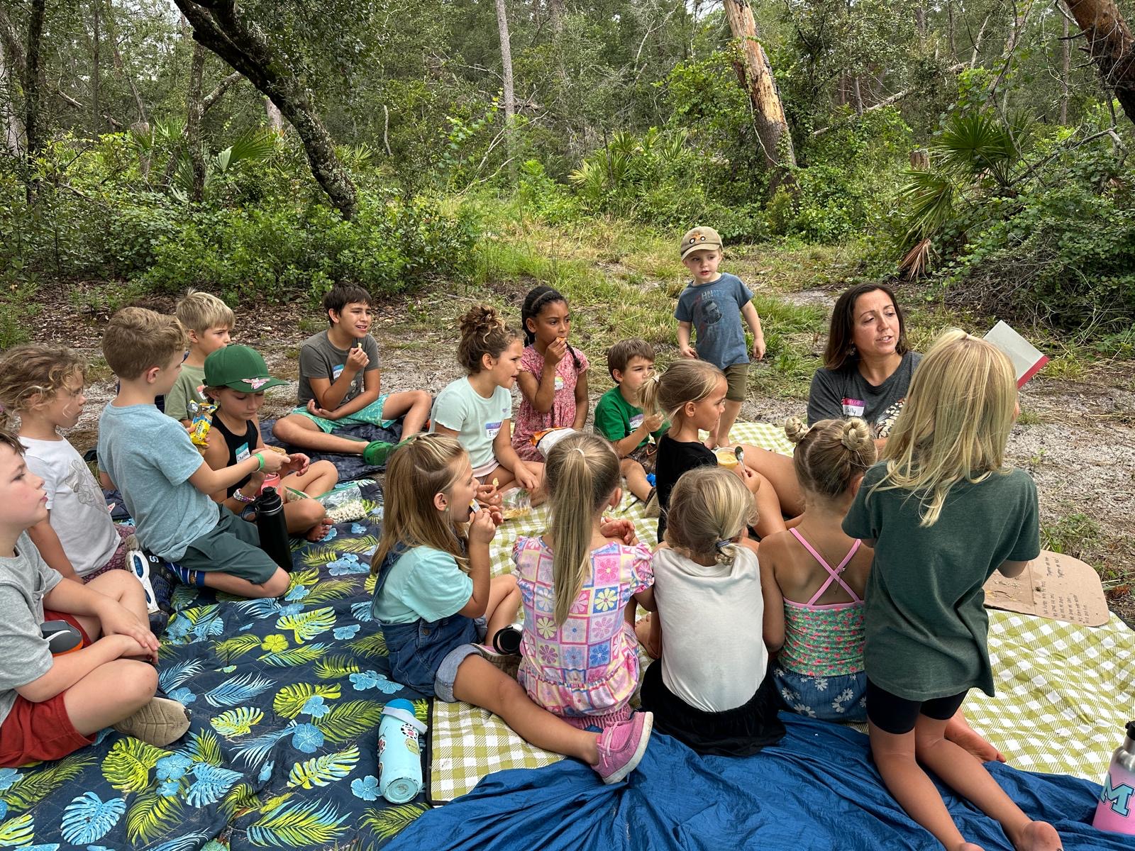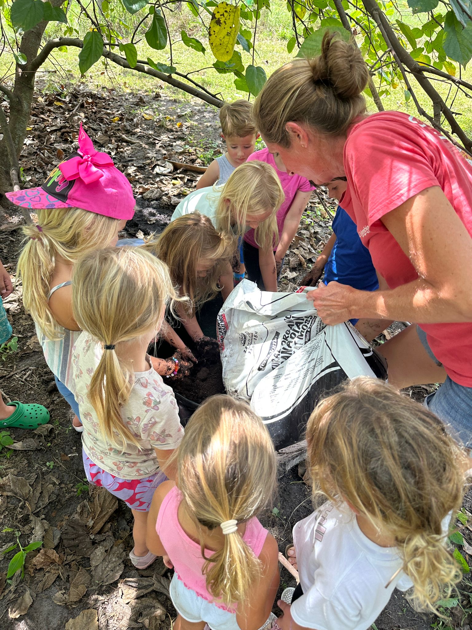 After each of Kelly’s activities, the children had time for free play while the moms connected on the sidelines. On their own, the kids built water systems, examined bugs, balanced on the slackline, and even played “school”—reading aloud and creating nature art together. Who knows, maybe one day we’ll have even less of a hand in teaching! These weekly moments of fellowship mean so much to us as moms, while also giving the kids the space to follow their curiosity and build social skills—knowing we’re always nearby for a cuddle after a buggy bite.